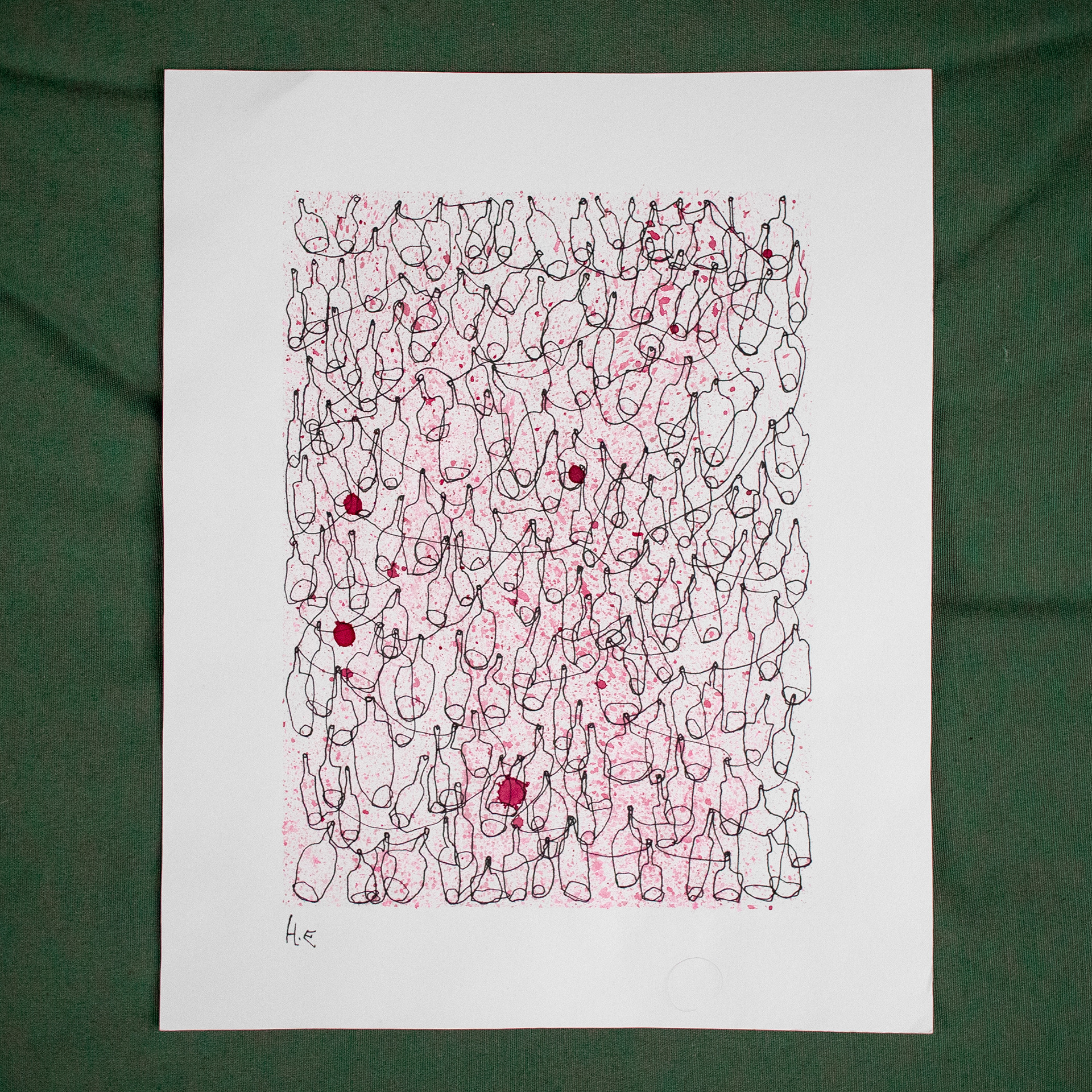 bottles drawn left-handed, paint-splashed