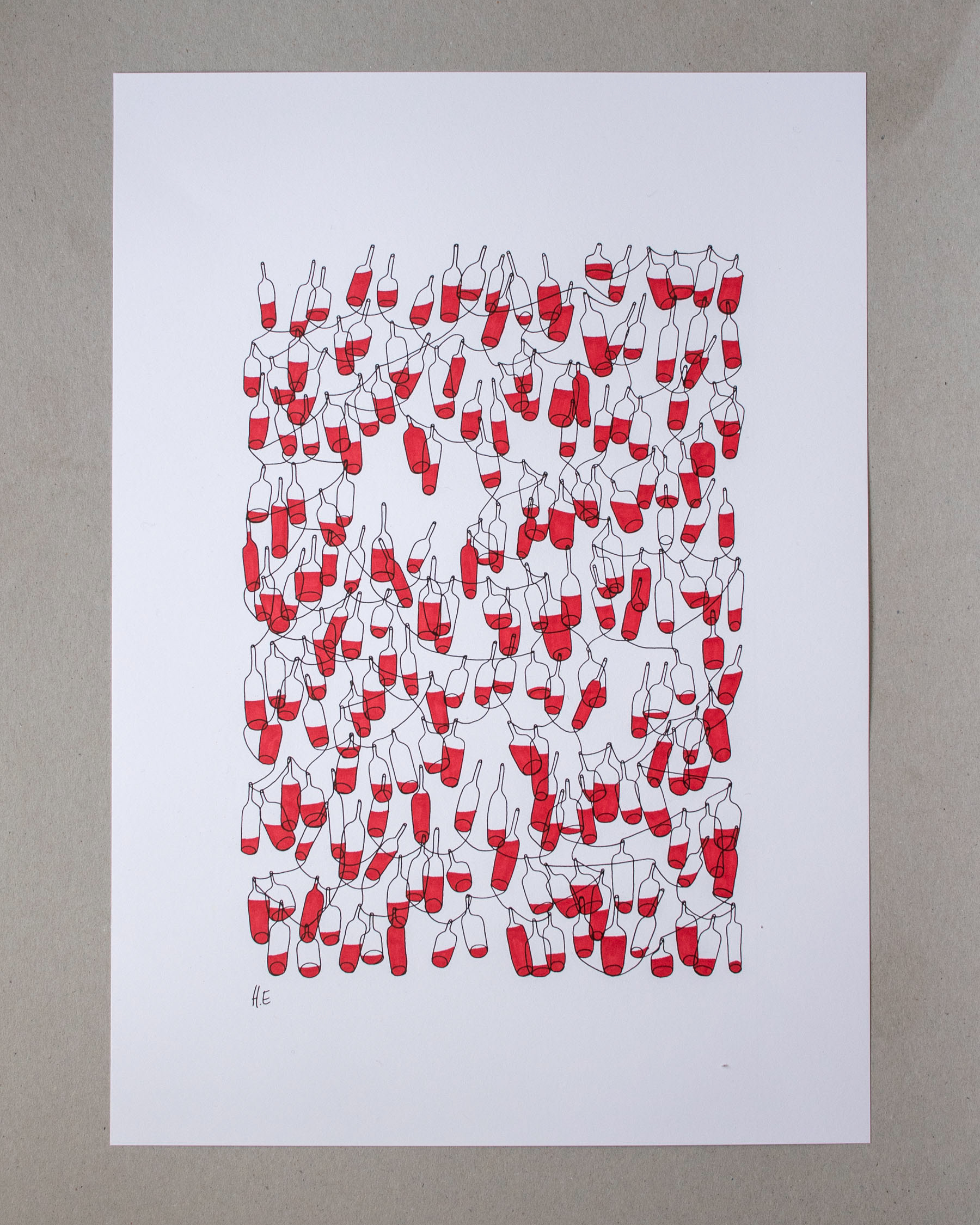 A chance to play around with some new styles. I made ten prints of the drawing #41, then filled the bottles differently for each one. Creating something half print, half original.