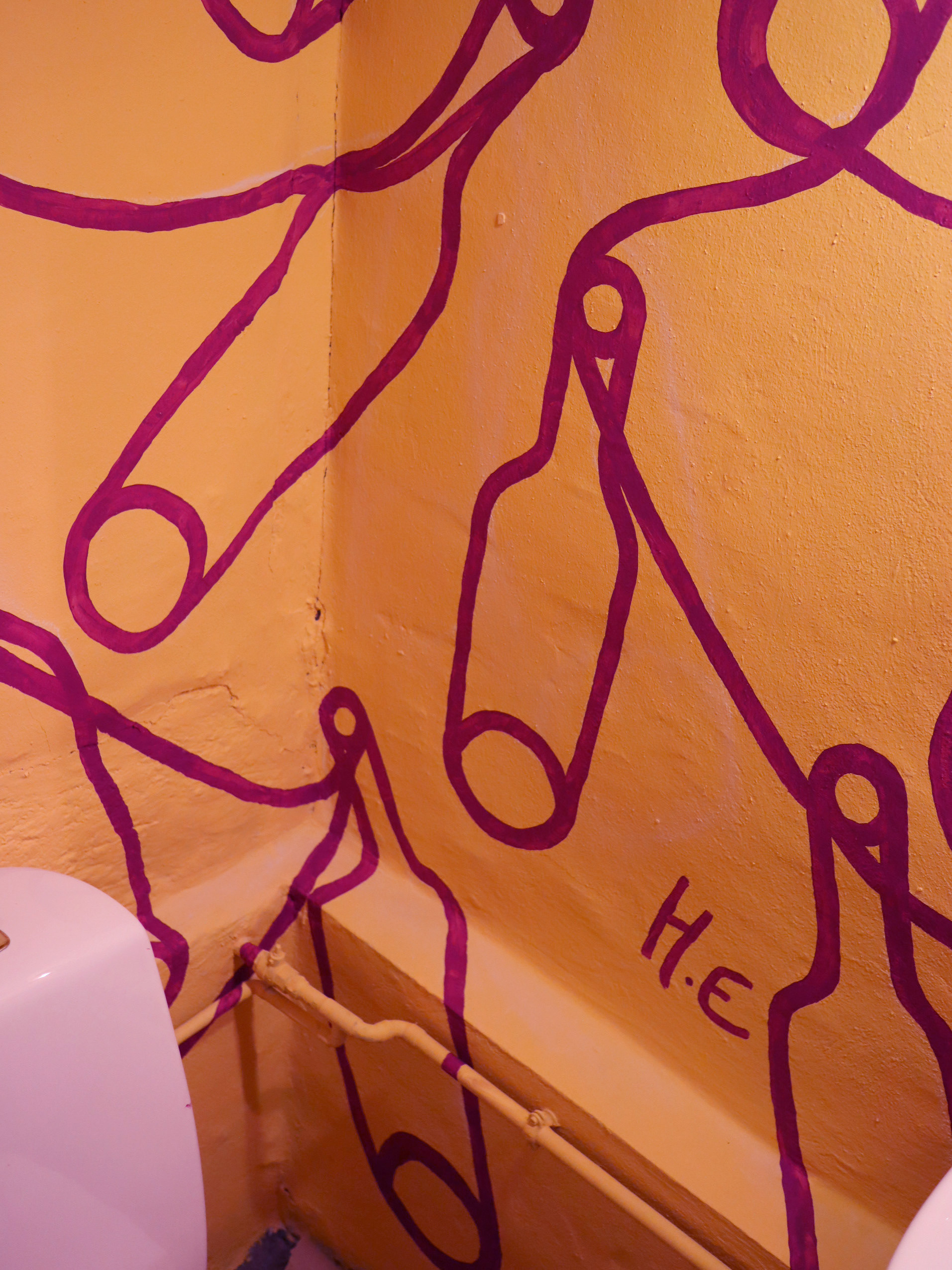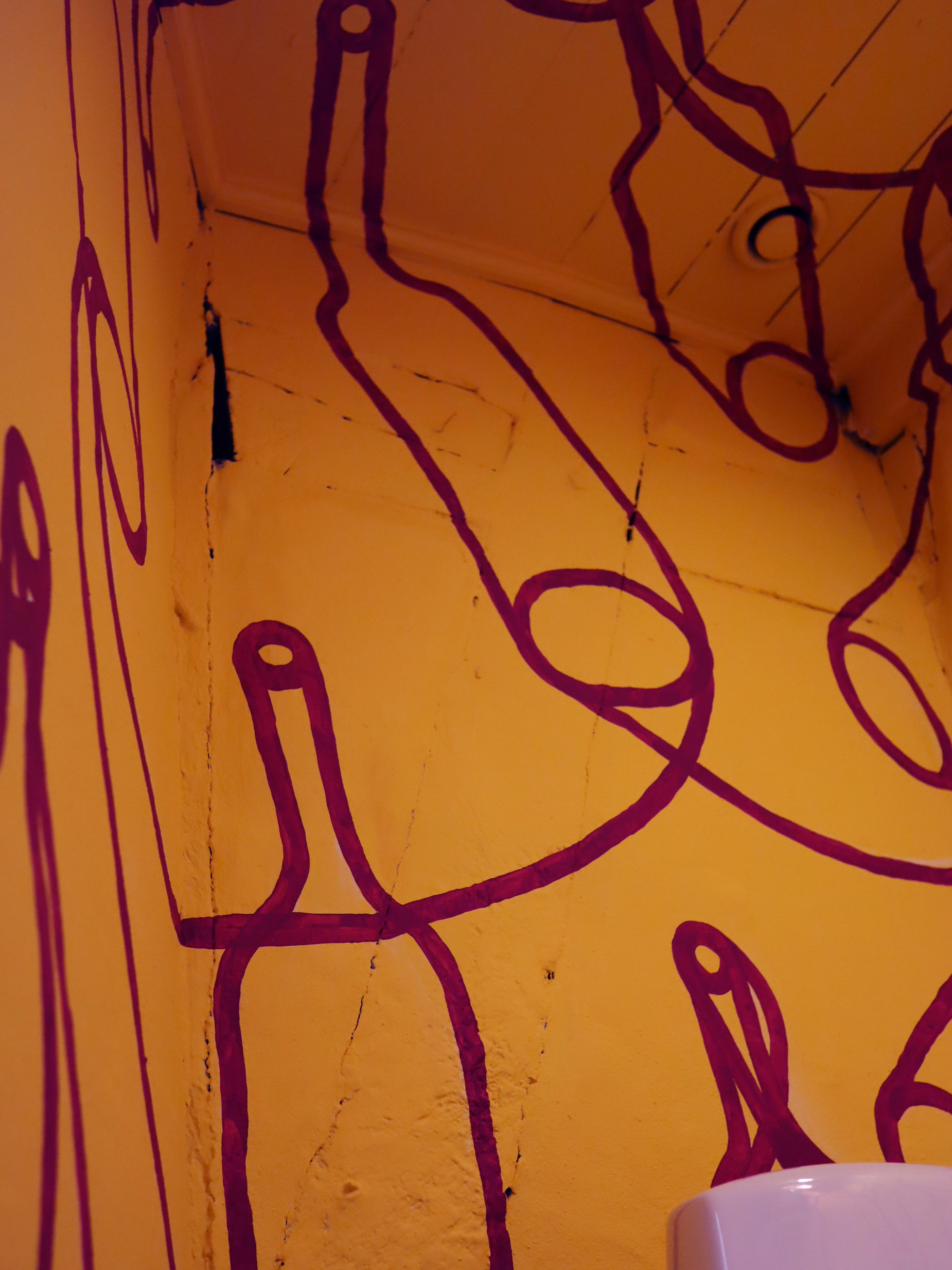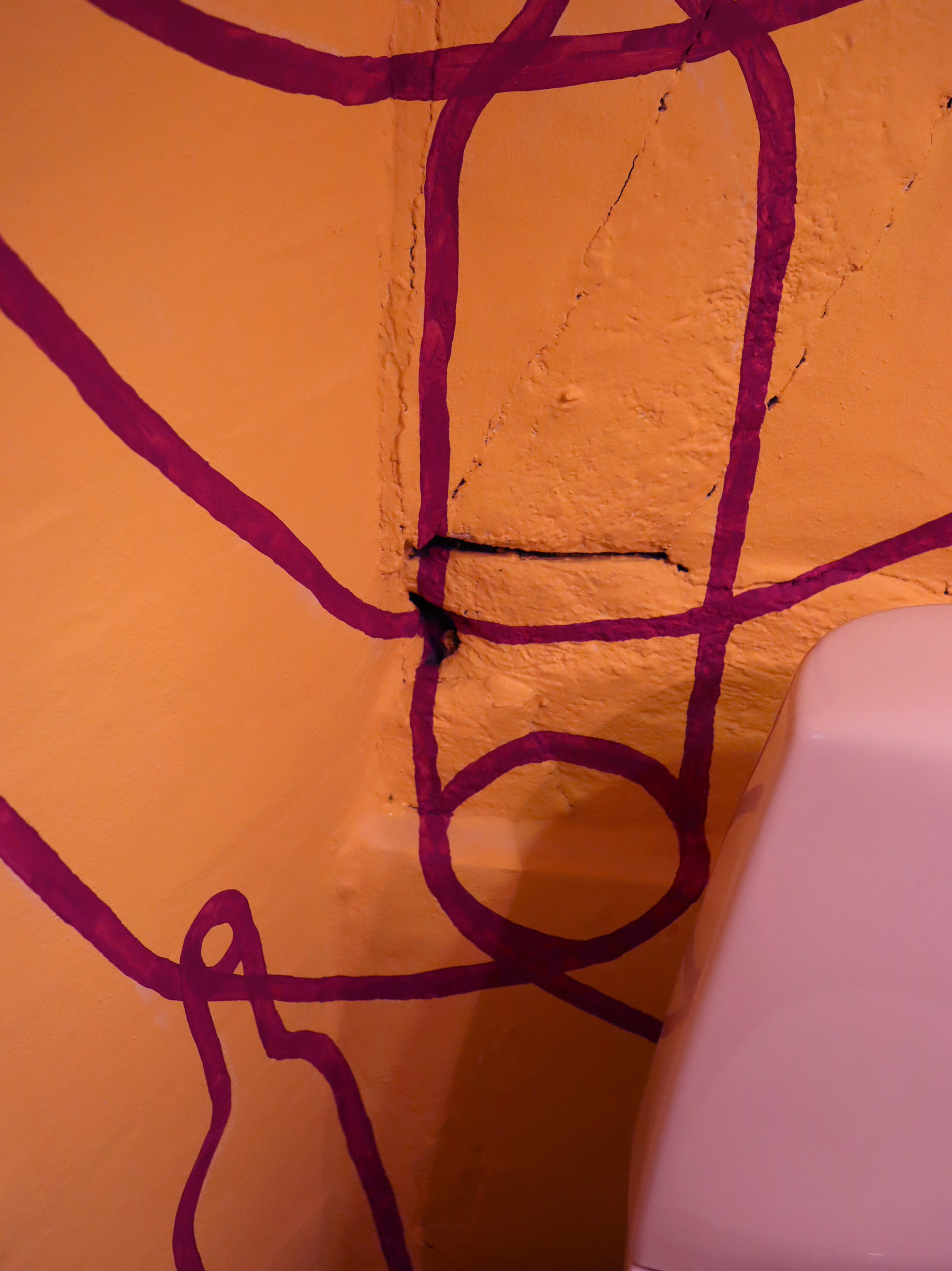 's bathroom, on several different surfaces, across corners and holes, behind a sink and a toilet.