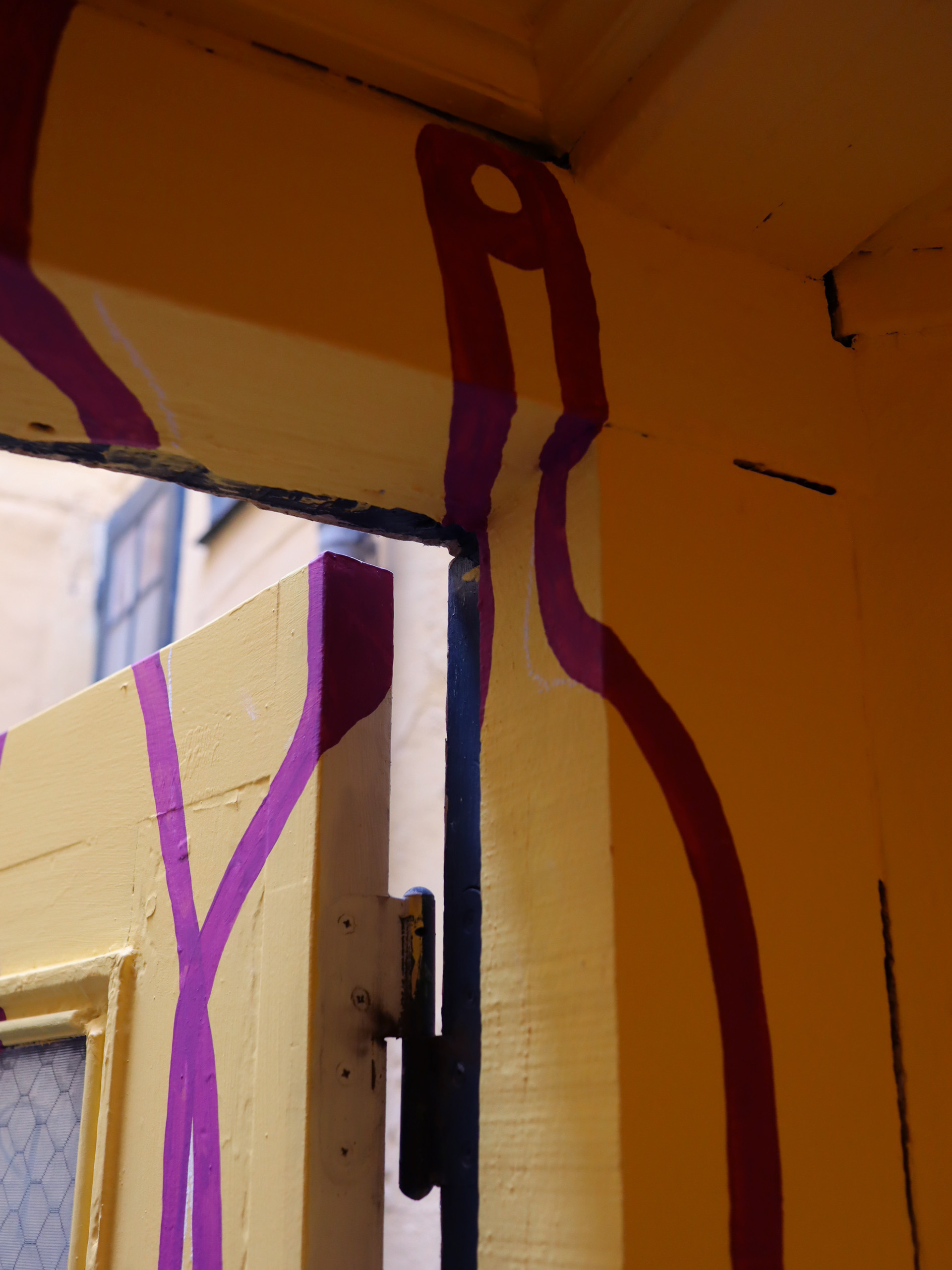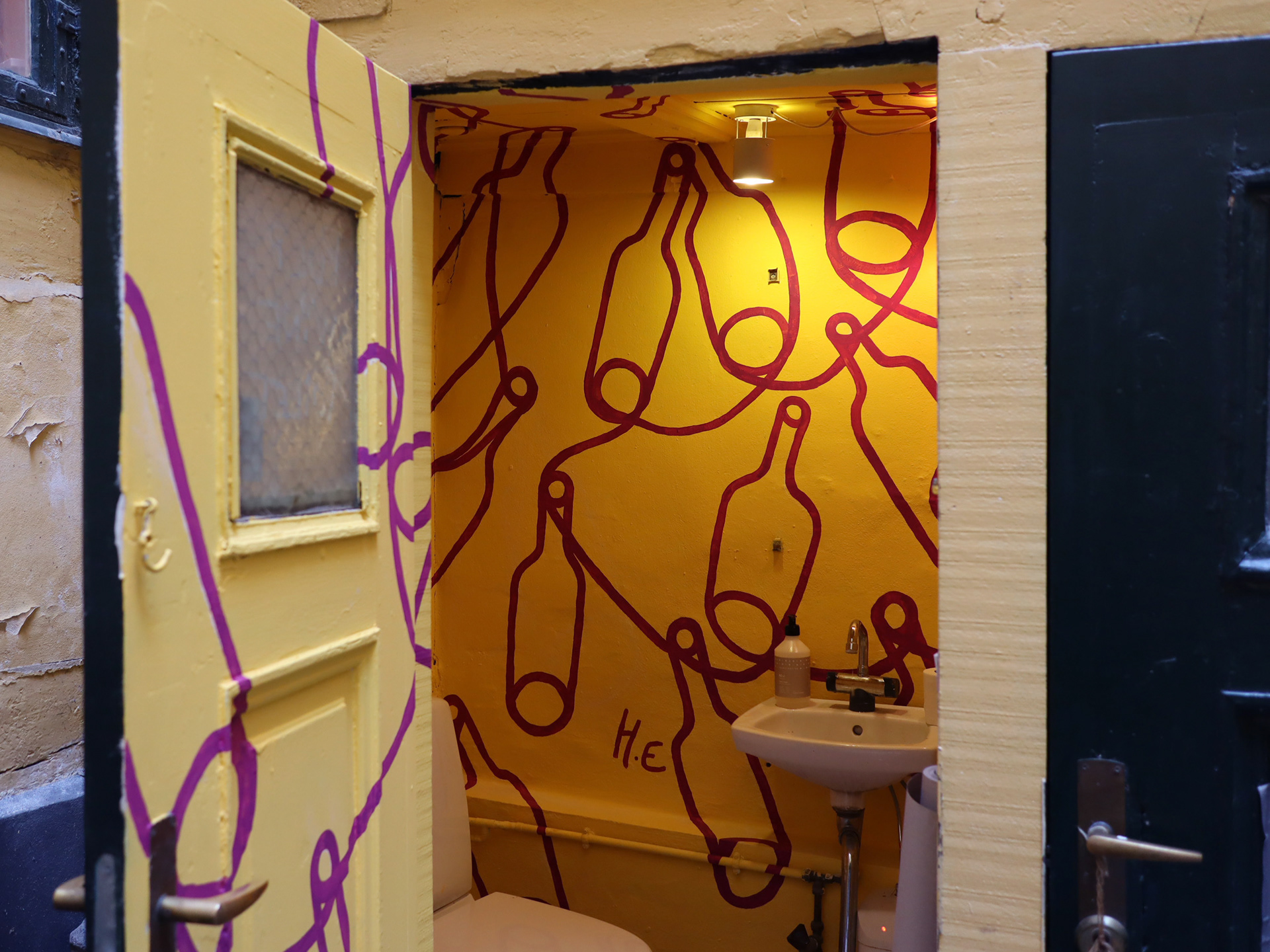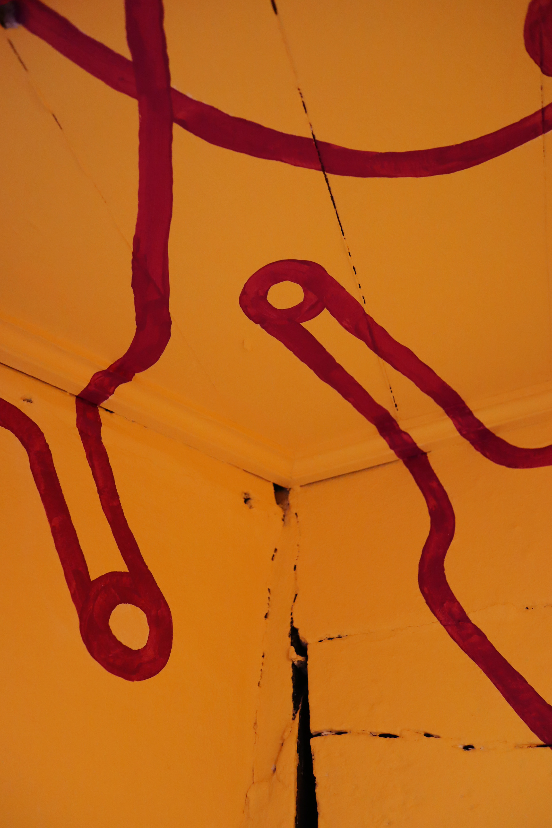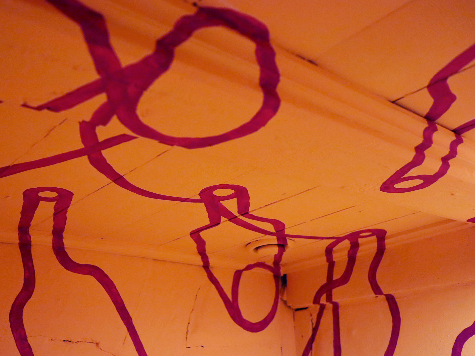 's bathroom, on several different surfaces, across corners and holes, behind a sink and a toilet.